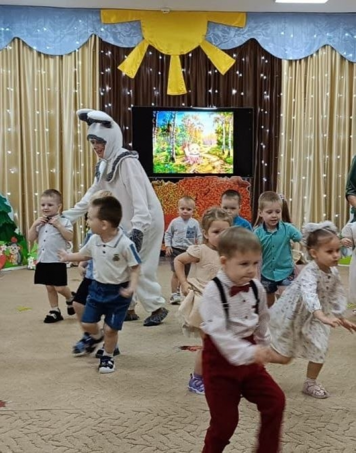 сказочным спектаклем "Про Антошку и домовенка Кузю".К празднику ребята подготовили красочные музыкальные номера "Танец лягушат"